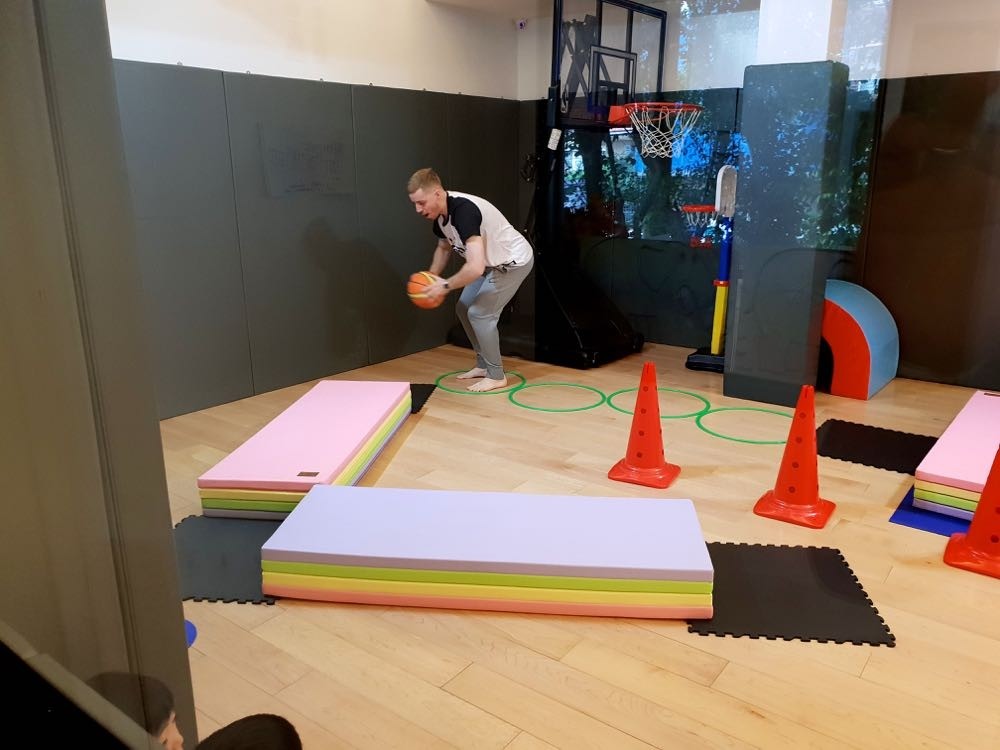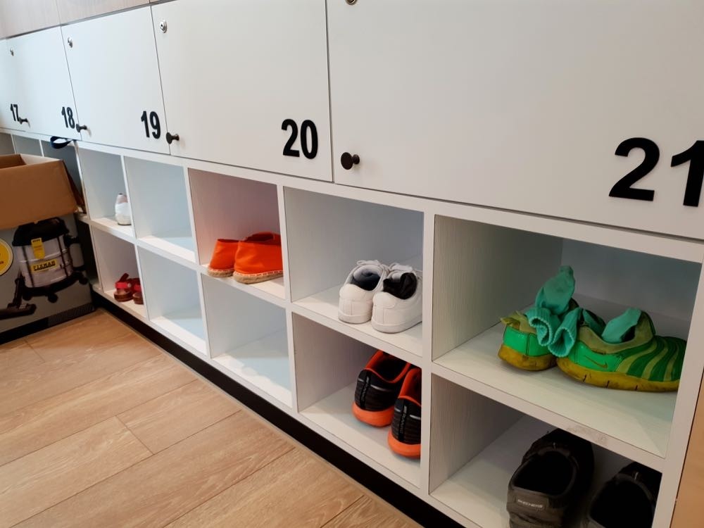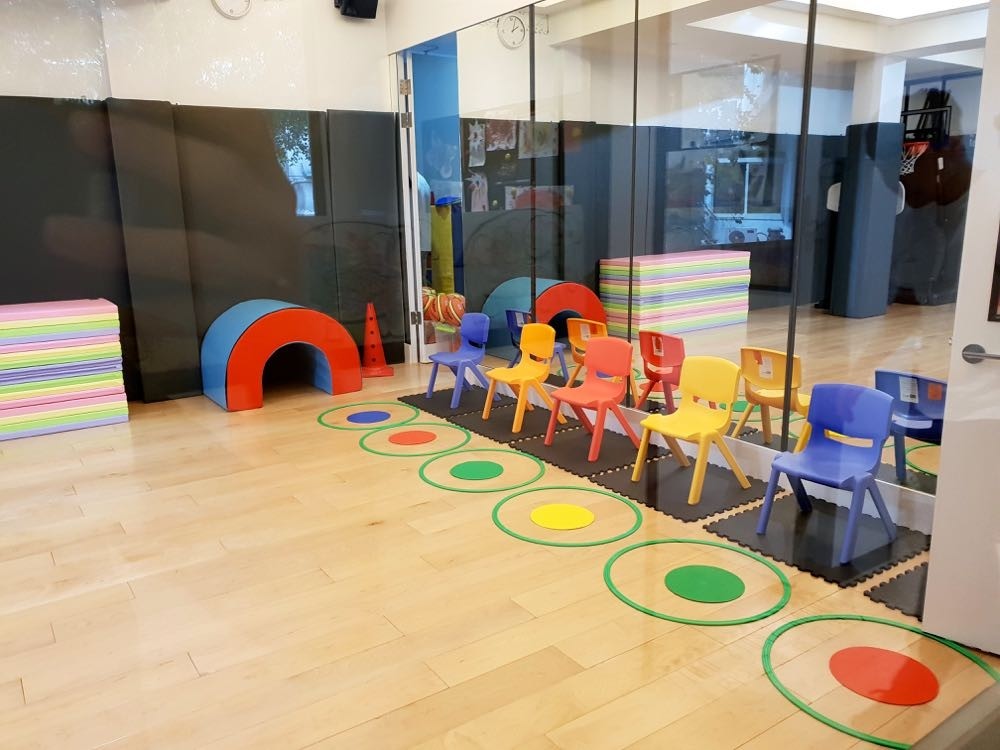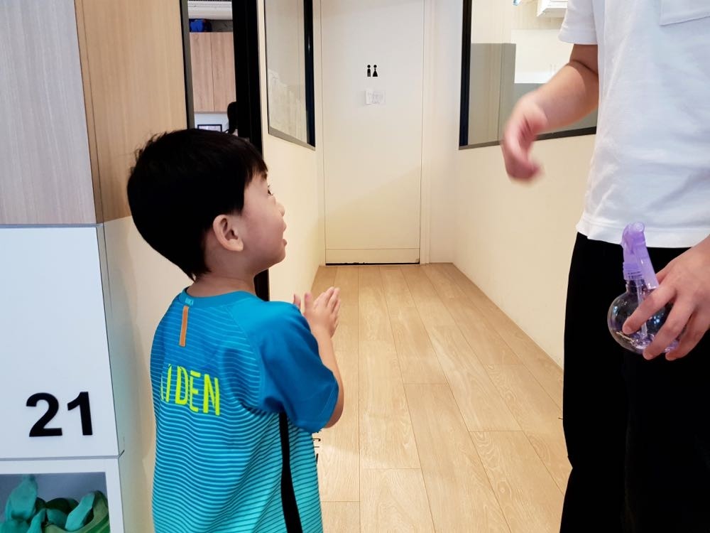 來到了今天的重頭戲- 3-4 歲籃球課,先簡單介紹一下課程流程。小朋友會將鞋子、襪子脫掉接著用酒精將手消毒後進去教室。10:00-11:00 的課程大致上分為三段,每一段老師會有不同的主題,中間讓小朋友出去喝水休息一下,老師們開始佈置下一段的教具。