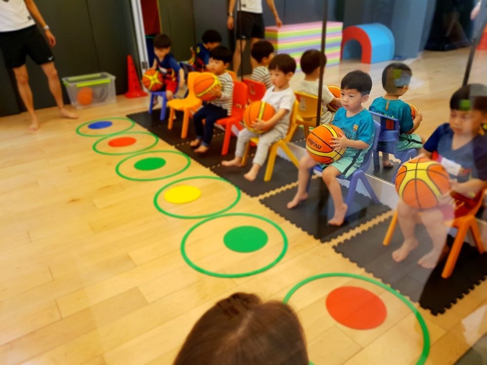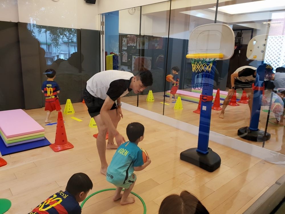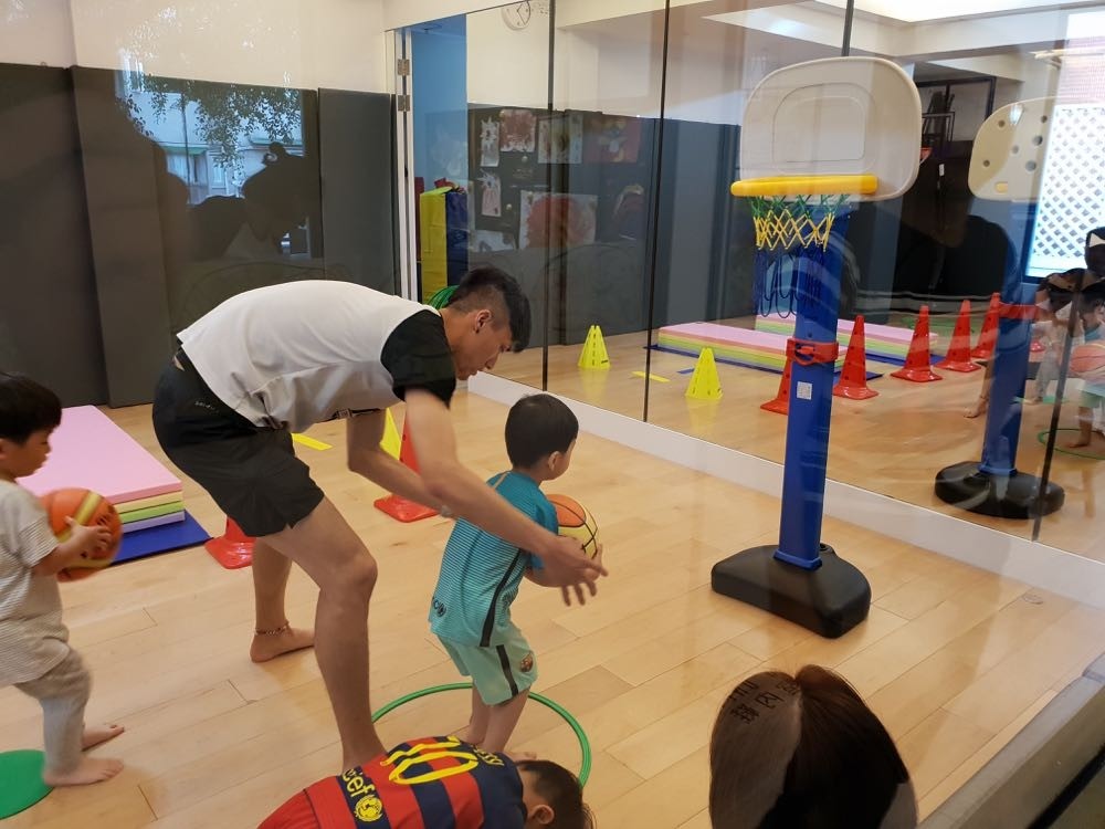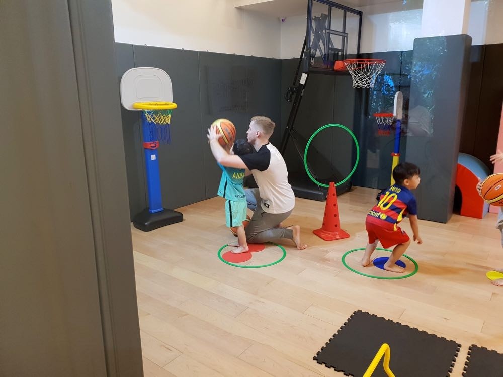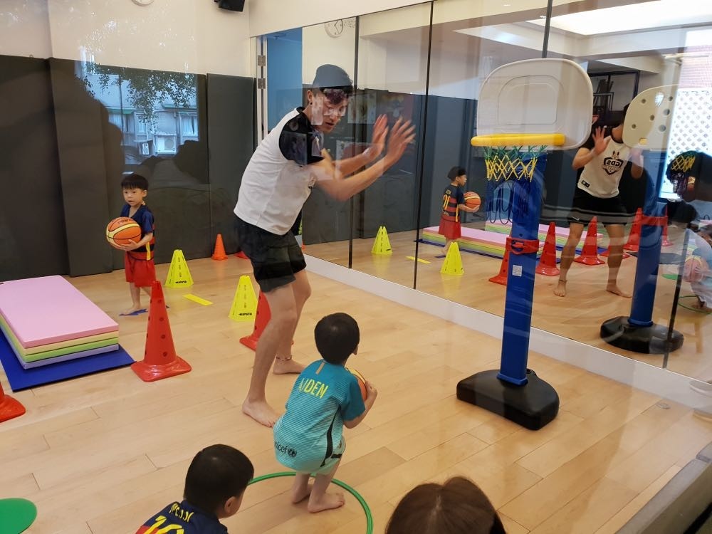 因為這堂是以 3-4 歲的小朋友為主,所以可以讓一位家長進入陪同來讓小朋友更快地適應環境。老師不錯的是除了都有關心到每位小孩的動作進行隨時加以指導外,還會用簡單的英文和小朋友進行互動。例如問小朋友椅子是什麼顏色?籃框要高一點還低一點?一起數 1、2、3 等一些基本的英文對話。