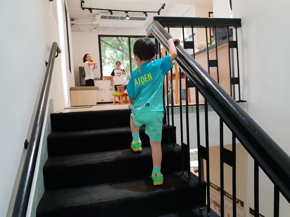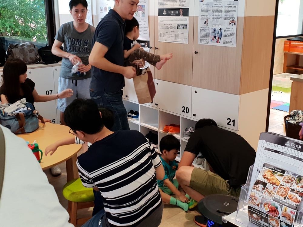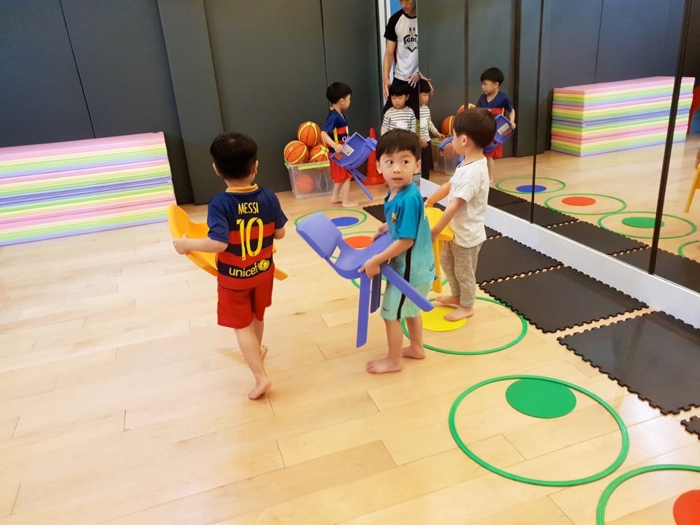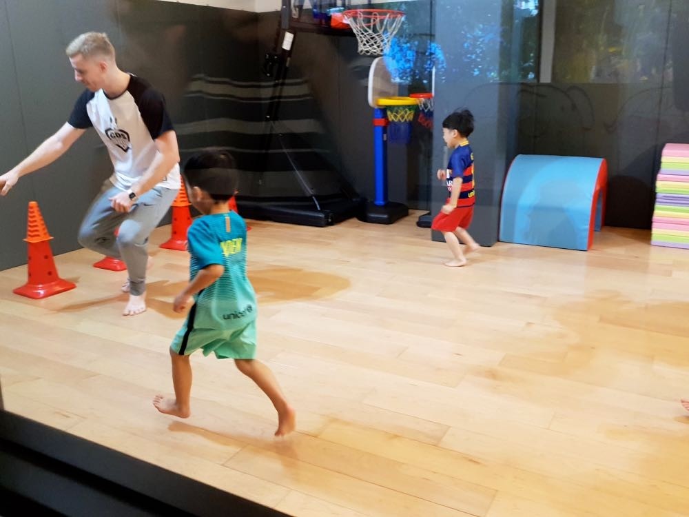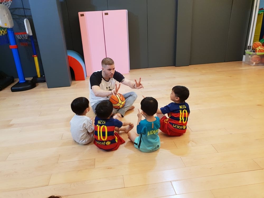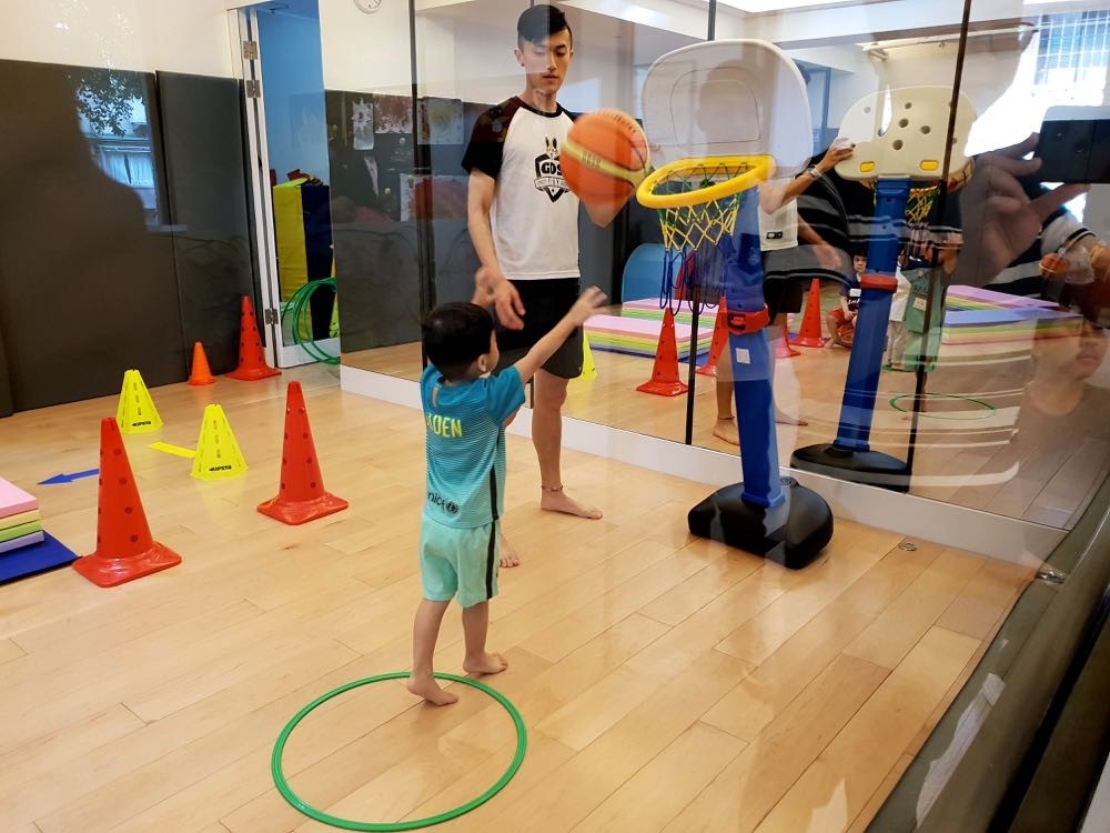 因為這堂是以 3-4 歲的小朋友為主,所以可以讓一位家長進入陪同來讓小朋友更快地適應環境。老師不錯的是除了都有關心到每位小孩的動作進行隨時加以指導外,還會用簡單的英文和小朋友進行互動。例如問小朋友椅子是什麼顏色?籃框要高一點還低一點?一起數 1、2、3 等一些基本的英文對話。
