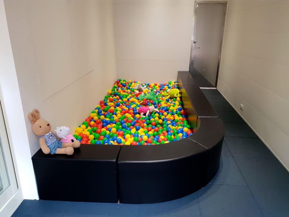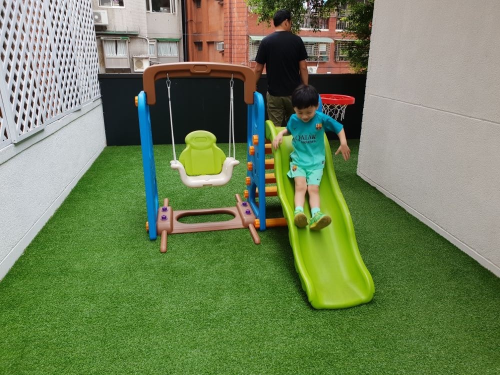 ▲ 2 樓外面陽台是一個小巧的戶外空間,有放置簡單的溜滑梯、盪鞦韆和迷你高爾夫球組讓小朋友在等待上課,或是下課後還能在這邊曬曬太陽活動一下。