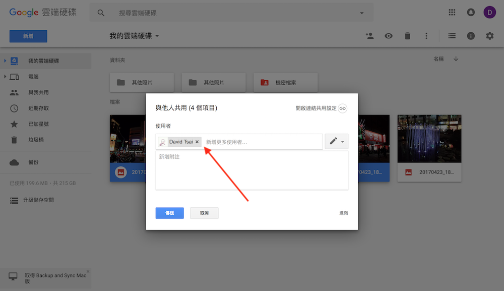 已圈選欲分享的檔案後,接著即可點選畫面右上角的「共用檔案」圖示,這時 Google Drive 就會出現與他人共用的頁面,除了可以在方框中輸入其他人的 Google 信箱地址之外,也可以在下方的「新增附註」方框中輸入給對方的留言,讓對方在收到檔案時可以清楚知道檔案內容。