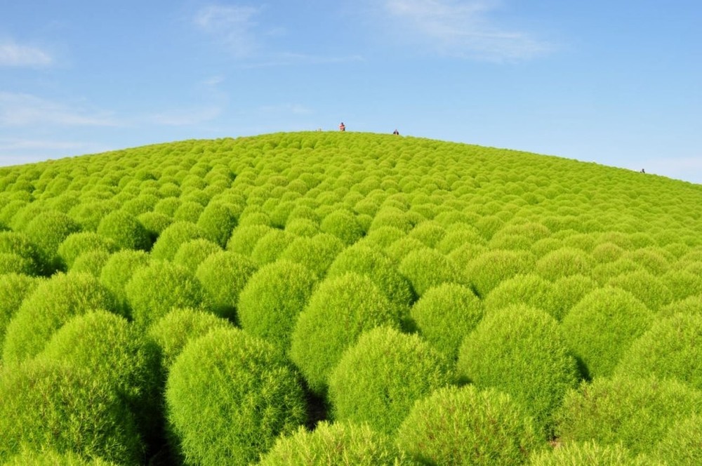 希望某天的秋天有機會拍到啊………。是說,如果五月粉蝶花和十月掃帚草都看過的朋友一定會發現它們是長在同一個地方、同一片丘陵。是的,國營日立海濱公園於每年三月左右開始種下450萬株的粉蝶苗,於四月中開始開花到五月初極大期,五月後開始花謝,直到七月初左右園裡便將之翻土變成肥料,八月之際開始改種掃帚草,約九月時掃帚草是綠色的(如下圖),然後跟著季節變化一直從橘變成粉紅再到全紅,可愛到翻..認真說我愛掃帚更甚粉蝶,因為多了層次。只可惜我前後兩次去都沒碰到極大期。
