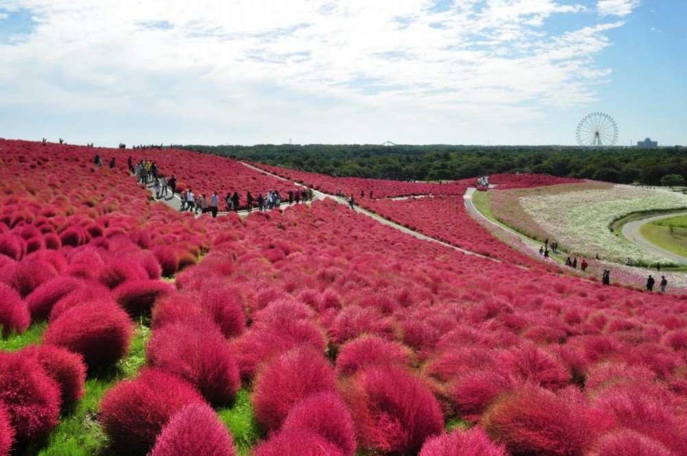 因為拍攝的前一天下了場大雨,讓粉蝶花不是那個飽滿、張開,所以引用另一張來自國營日立海濱公園官網的照片給大家欣賞,順便再補一張十月左右也很火紅的掃帚草↓。
