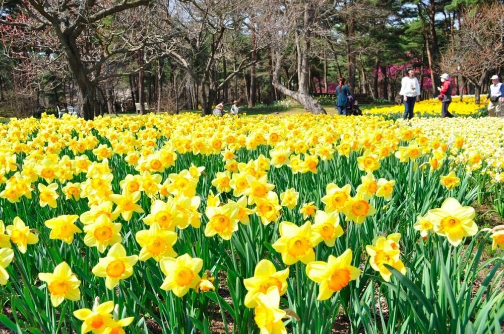 1公頃大的松林下,陽光透過綠葉輕輕灑在550種・100萬株的水仙花上,帶來如幻的春色魅力。高雅清逸的花姿以及迷人花香,令人深深著迷。