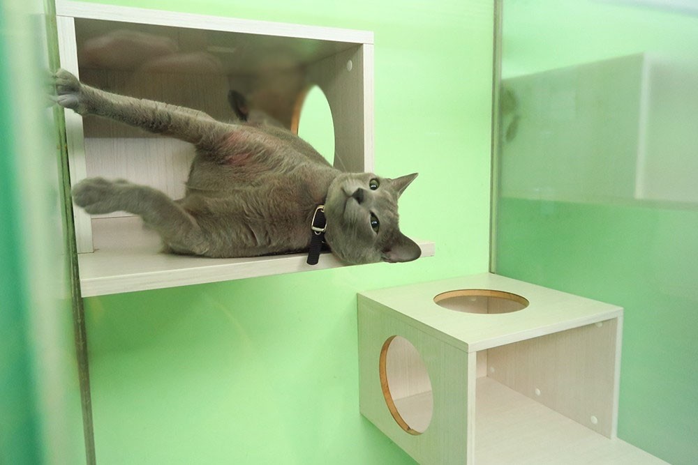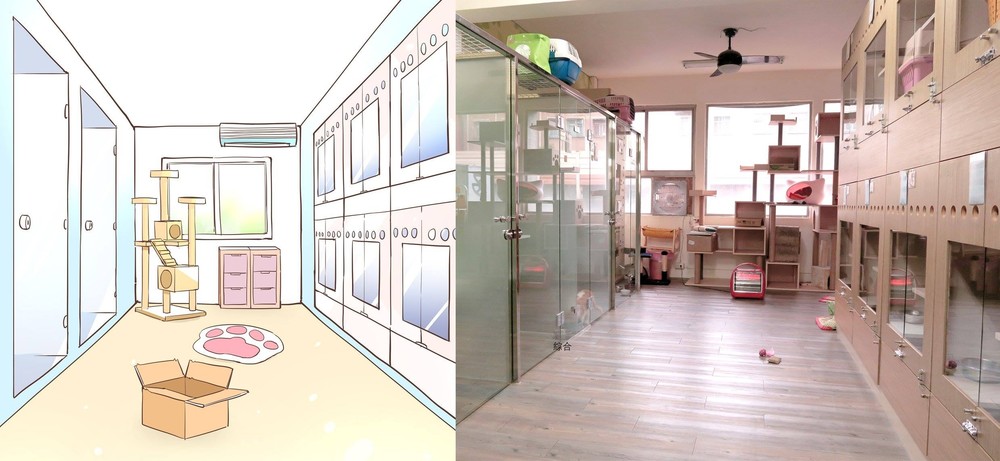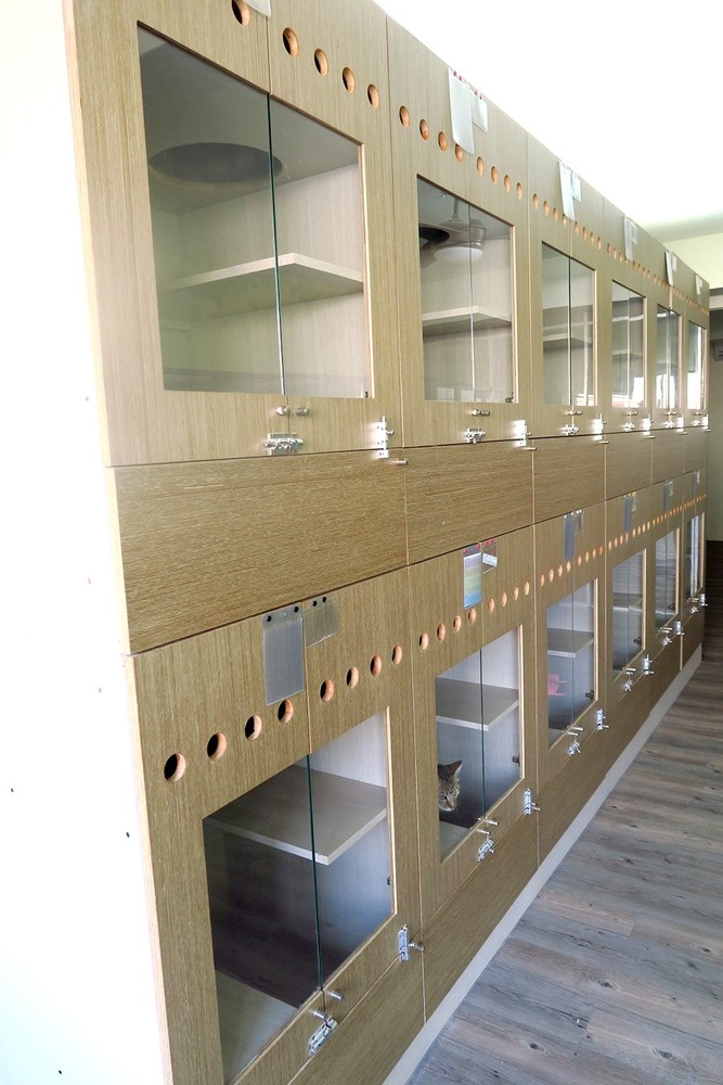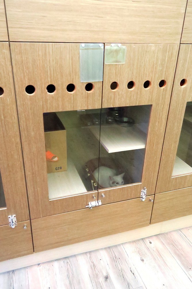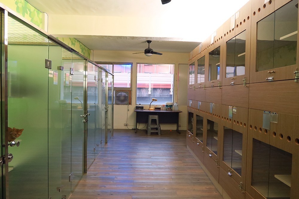玻璃窗房間雖然大,但不是每種貓咪都適合住,比較神經質的貓咪,會因為沒有陰暗的地方可以躲藏,左右的霧面玻璃又不時會看到其他貓咪,而住的心驚膽跳的。