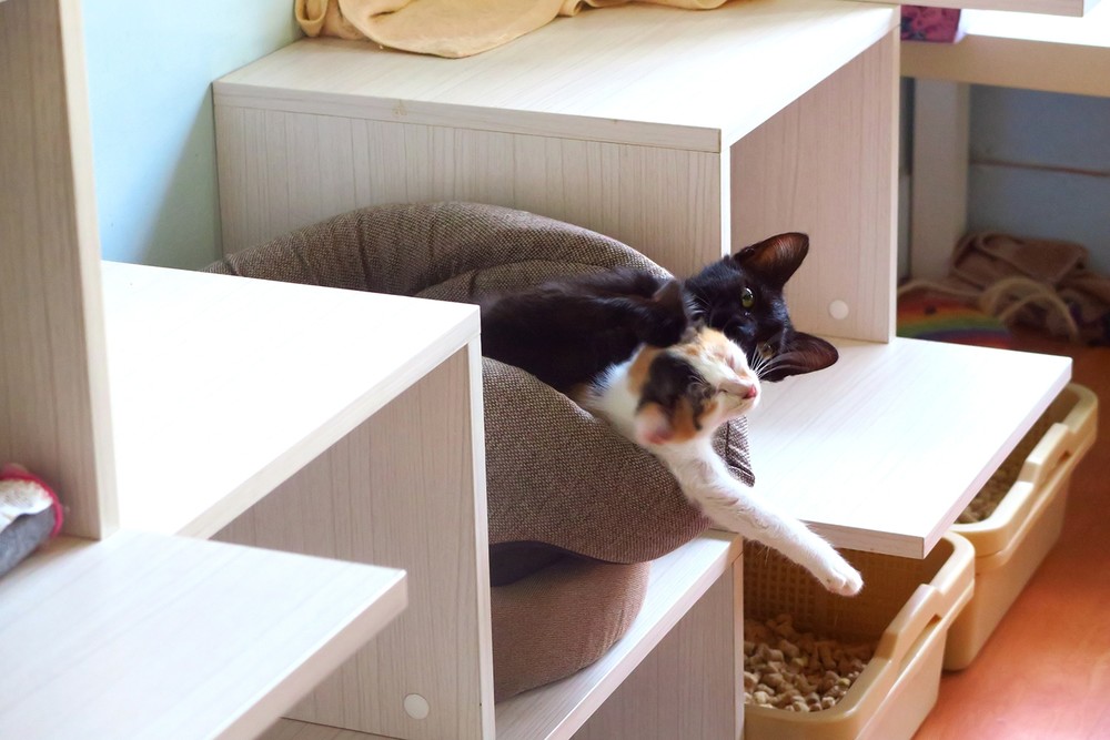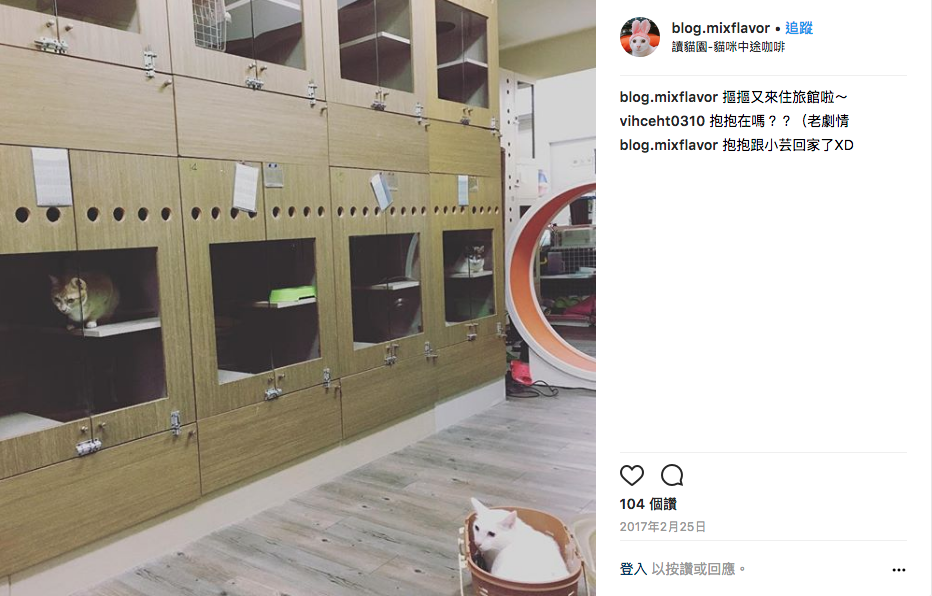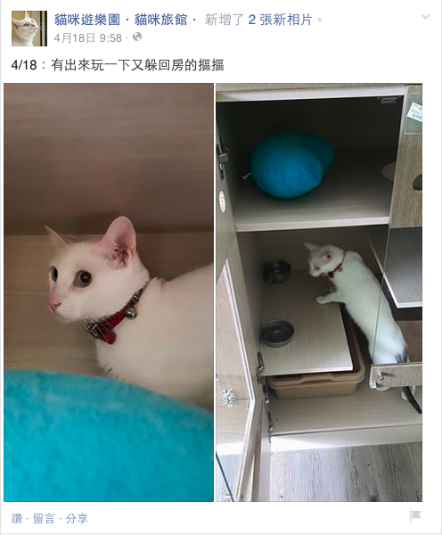 貓咪的地域性真得很強呢!我們家摳摳雖然算親人,但跟貓咪同伴都處不太好⋯⋯而貓咪遊樂園有限制住宿貓咪的數量,現在也不是旺季,所以貓客人不多,我們就是看中這裡的安靜暇意,讓膽小的摳摳放心休養XD
