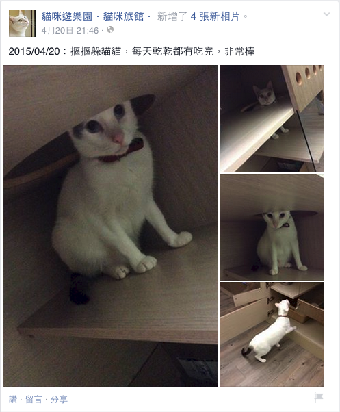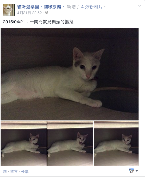 住宿期間,貓咪遊樂園會每天都會傳幾張摳摳的照片到貓咪遊樂園的粉絲團,我們能持續專注摳摳住宿狀況~(這邊只取其中四天的照片)