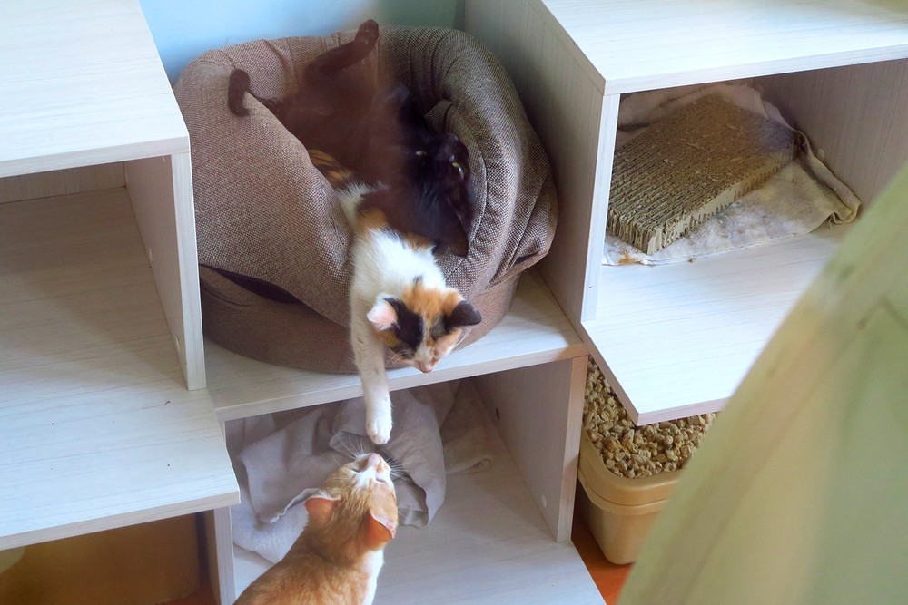 看完這些可愛爆表的小貓咪,我們先上三樓的貓咪旅館吧!上樓之後先脫鞋子,接著就會看到一間一間的住宿房間囉!左邊全玻璃的房間,空間比較大,適合多隻貓咪同居~右邊區空間比較小,適合1~2隻貓咪住宿。