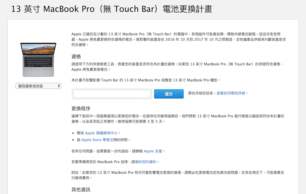 根據蘋果台灣官網上的貼文指出,已確定在少數的 13 吋 MacBook Pro (無 Touch Bar) 的電腦中,發現某個組件可能會故障,進而導致內建電池有膨脹的疑慮。為了使用者的安全,蘋果將啟動免費更換符合資格電腦的電池計畫,凡事在「2016 年 10 月到 2017 年 10 月之間製造」的產品,都可以拿到蘋果授權維修中心、Apple Store 零售店進行檢測,若序號正好在出現問題的範圍中,即可免費更換全新電池。
