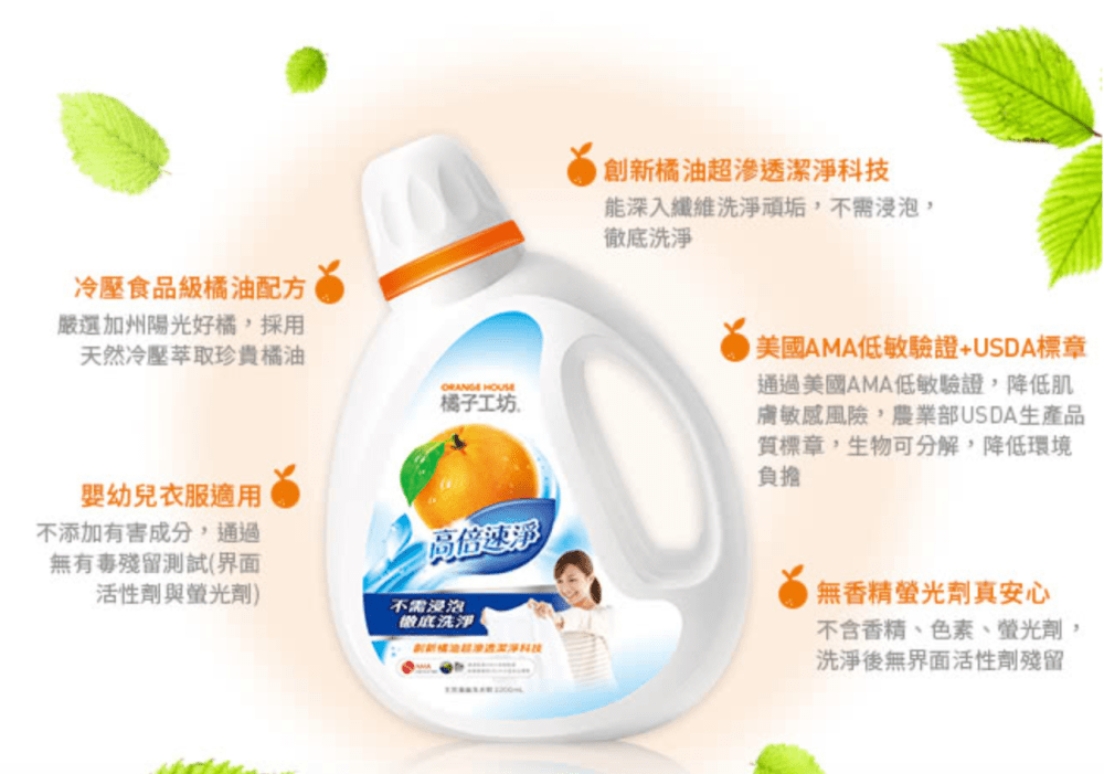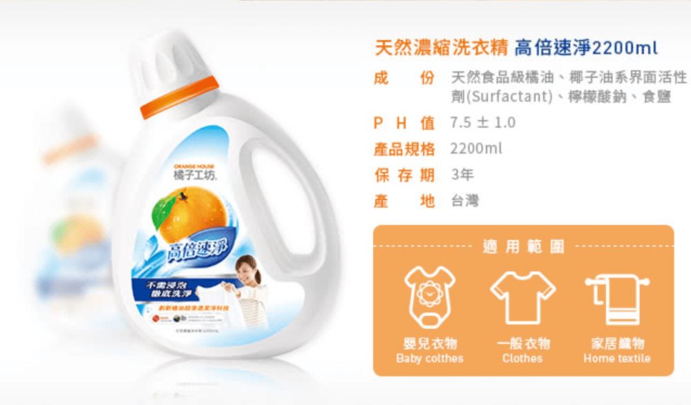 當然,除了天然濃縮洗衣精高倍速淨之外,其實橘子工坊還有很多不錯的家庭用清潔產品,也都是走天然無添加的健康安心路線,喜歡的朋友也可以來研究一下