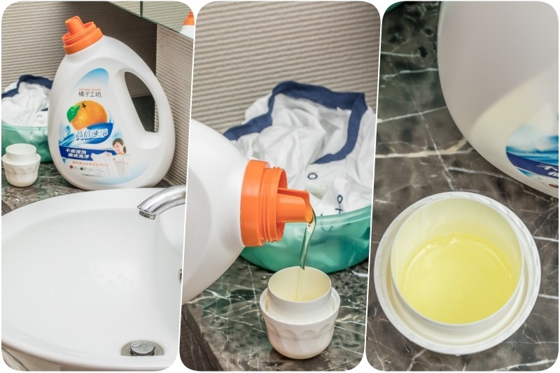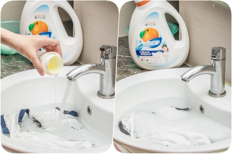 接下來,就是正式打開橘子工坊天然濃縮洗衣精高倍速淨,因為是溫溫的衣服所以熊用手洗,洗衣精份量大約是1/10瓶蓋(正確使用量可以參照背面的使用說明)