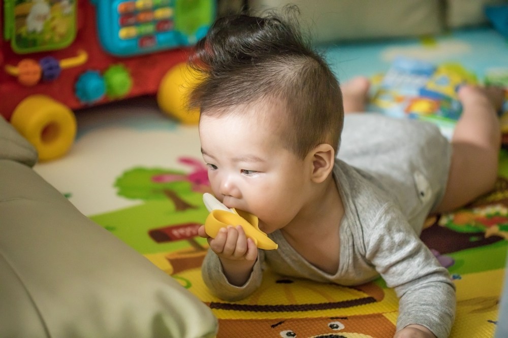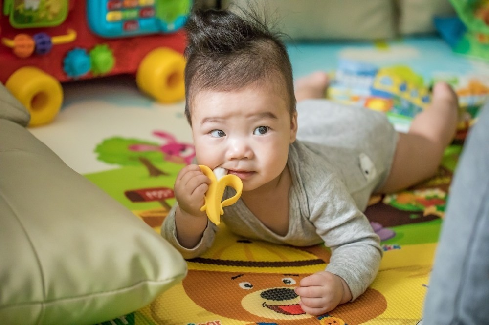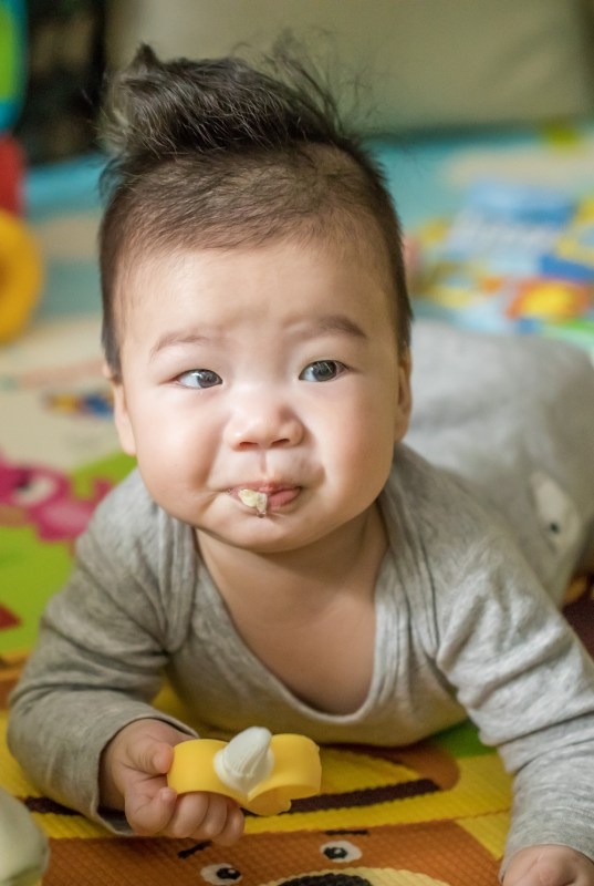 如果是沒生過小孩的爸媽,看到嬰兒這樣爬這樣咬,一定覺得很可愛。但如果有經驗的爸媽,這時候就會開始擔心,因為邊爬邊咬固齒器,而且越吃越深的狀態下,結果就是。。。。