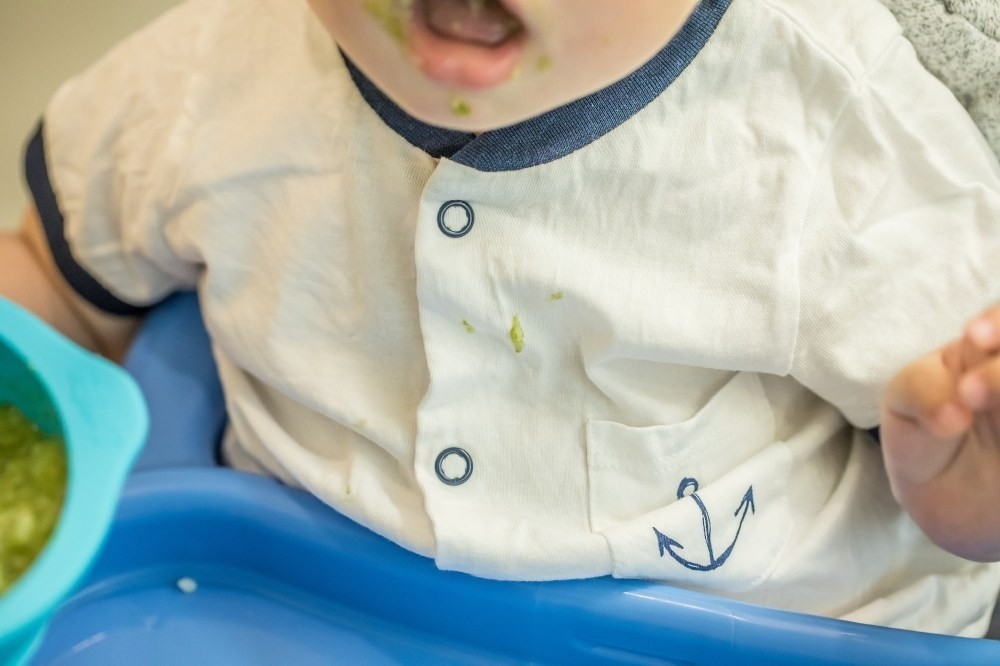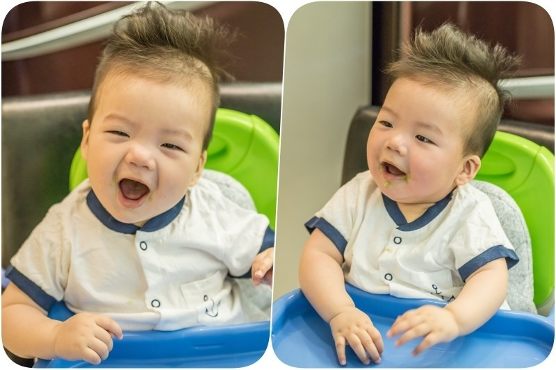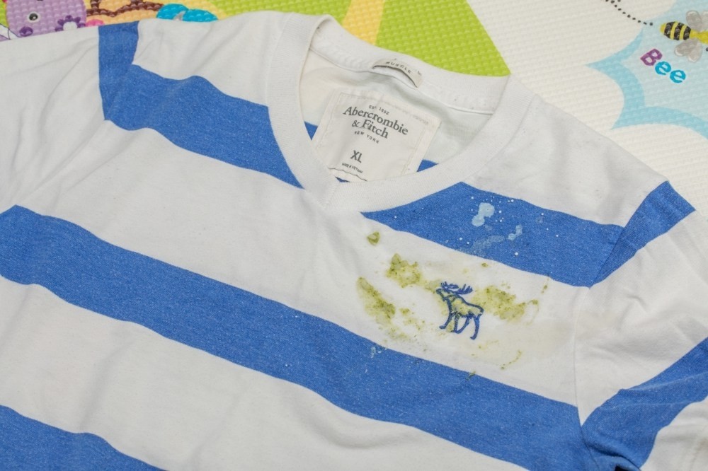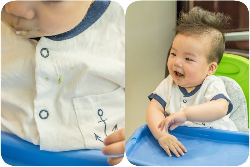 接下來就是驗收的時候到了,還記得衣服上被磨碎的蔬菜跟肉末粥還有香蕉泥吐到的狀態吧?一般來說綠色的蔬菜泥真的很容易殘留在身上
