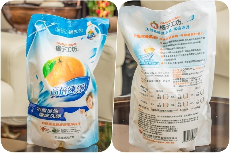 而這次體驗的橘子工坊天然濃縮洗衣精高倍速淨,是2200ml的家庭號,再加上一包2000ml的補充包