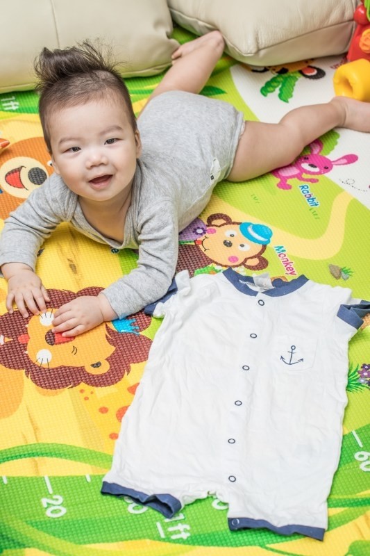 換完衣服之後,溫溫開始進行下午的運動,在墊子上玩得不亦樂乎,一邊還要咬著固齒器邊爬邊玩