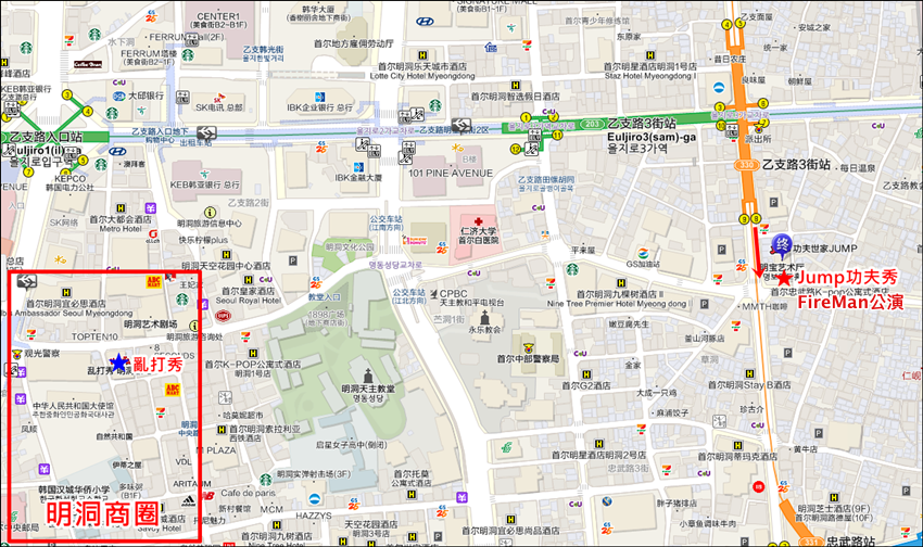 交通的部分,搭首爾地鐵2、3號線,都可以抵達「乙支路三街站」,8號出口直走就能到「明寶藝術廳」看Jump秀啦!如果直接從明洞商圈走路過來也大概是10~15分鐘左右,很方便~