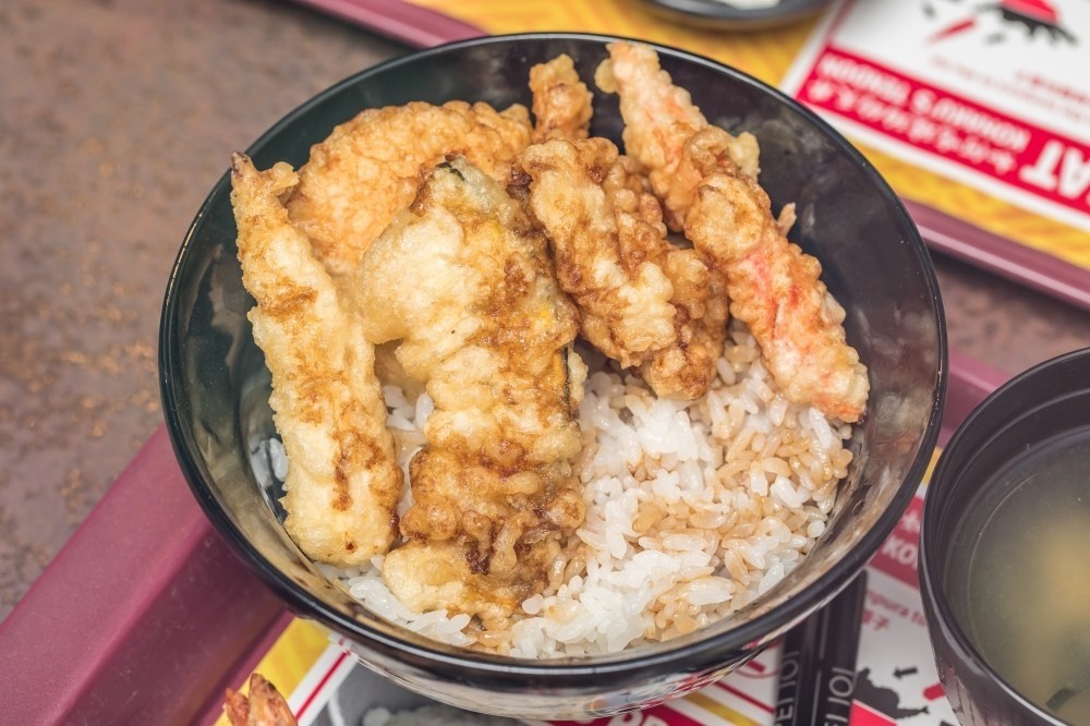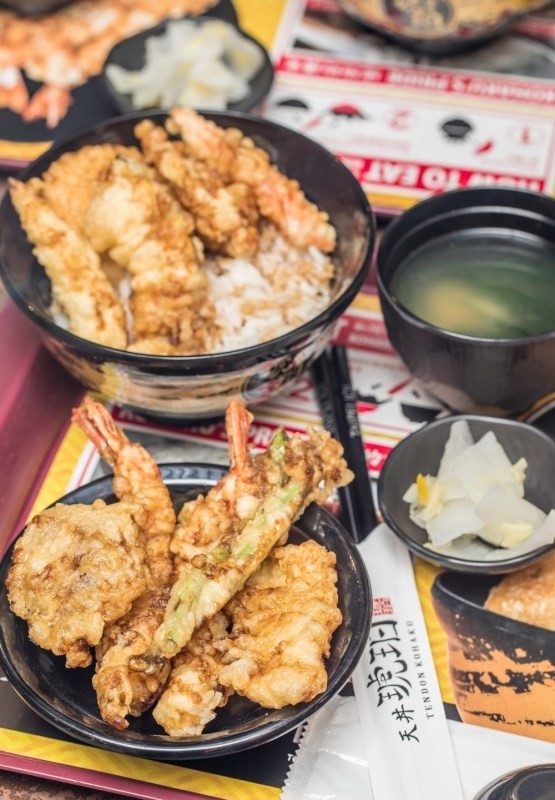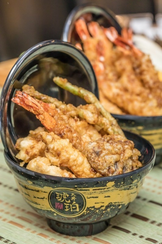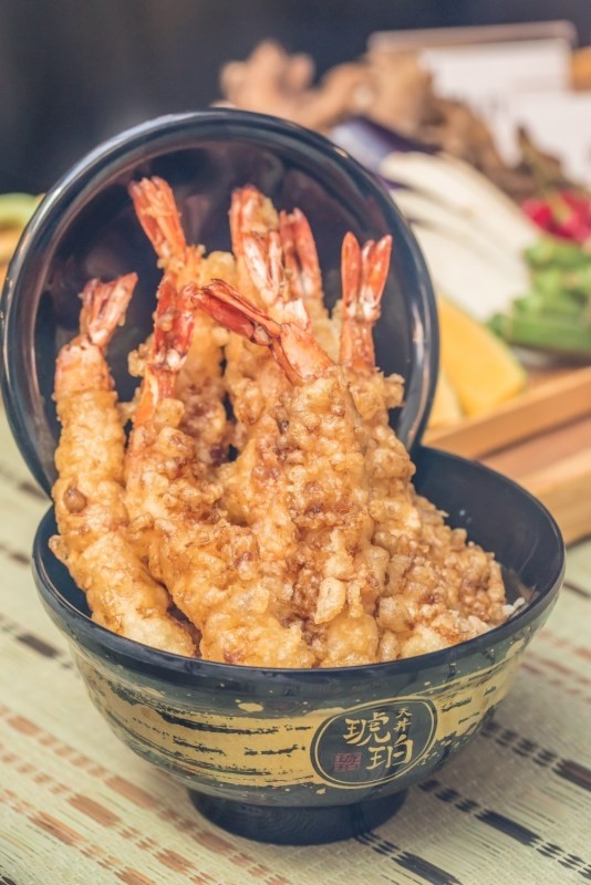 第一次品嚐Tendon Kohaku天丼琥珀的招牌料理琥珀天丼,除了任選日式風味或台灣辣醬油外,搭配北海道七星米或十六穀米的彈牙樂章,加上有著酥脆薄麵衣的肉類海鮮與蔬菜,不只過癮度十足而且越吃越有勁