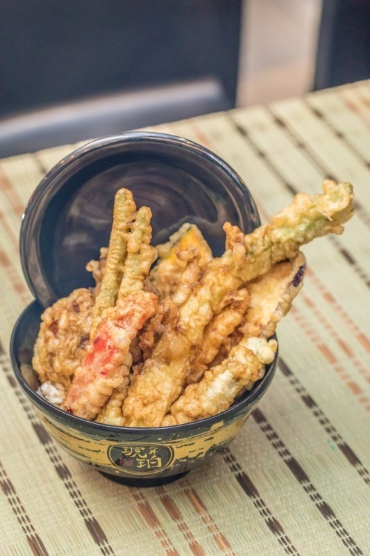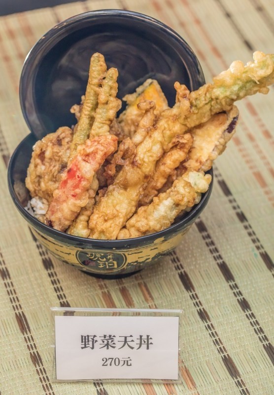 首先這一碗就是野菜天丼(270元,份),內容就是以蔬菜為主,包括四季豆搭配香菇茄子,還有玉米筍南瓜跟舞茸,加上秋葵蘆筍跟甜椒