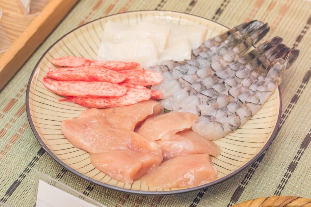 接下來就是招牌菜色琥珀天丼的食材部分,包括兩隻蝦跟雞肉,還有蟹肉棒跟花枝