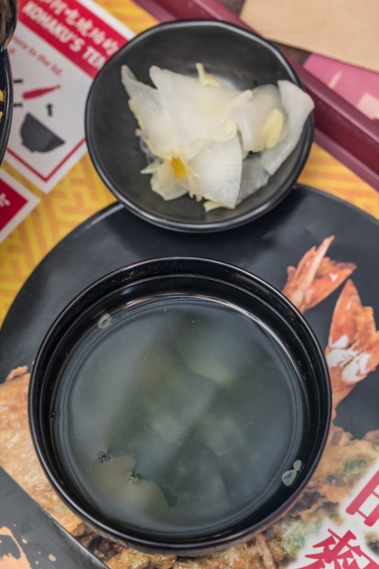 無論你挑選哪一種口味,這裡都是以套餐形式上菜,所以除了一碗天丼之外,都會附上味增湯跟特製柚子白蘿蔔薑片