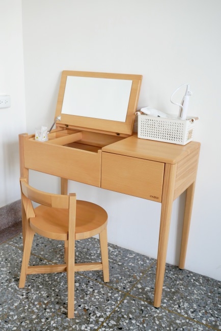 床架、邊桌、化妝台使用的是有情門的傢俱,希望選用台灣好物,讓整個空間更有家的感覺。