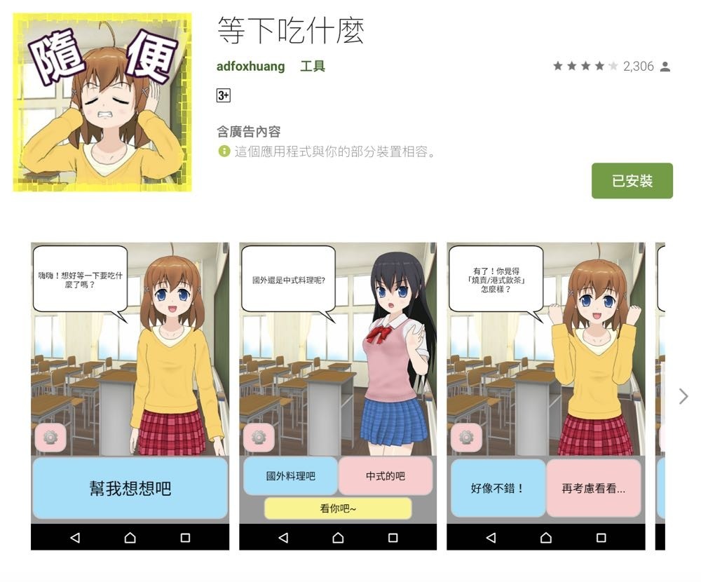 每次到了吃飯時間總是想不出來到底要吃什麼嗎?吃飯好呢?還是吃麵?吃咖哩?還是吃鐵板燒?那就讓小助理「等下吃什麼」app 來幫你決定吧!這款支援 Android 的「等下吃什麼」會有位可愛的女助理來給你二選一、三選一的問題後提供適合的餐點推薦,不過要注意的是… 這位可愛小助理還有點脾氣的唷!
