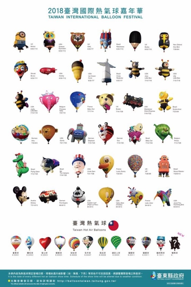 「2018 臺灣國際熱氣球嘉年華」在 6/30 起跑, 時間自 6/30 到 8/13 長達45天,這屆有歷屆最多顆造型熱氣球(39顆),其中有救世基督像「Cristo Redentor」、小小兵「Minion」、天外奇蹟熱氣球「Up」,聖經裡 的諾亞方舟「Arky」,國際化又新奇有趣,在鹿野高台與民眾一同狂歡!呼應 2018 狗年,還有可愛的英國鬥牛犬「Buster」與遊客見面,屬狗的球迷們,屆時要記得與「Buster」留下合影,留下難忘的回憶。