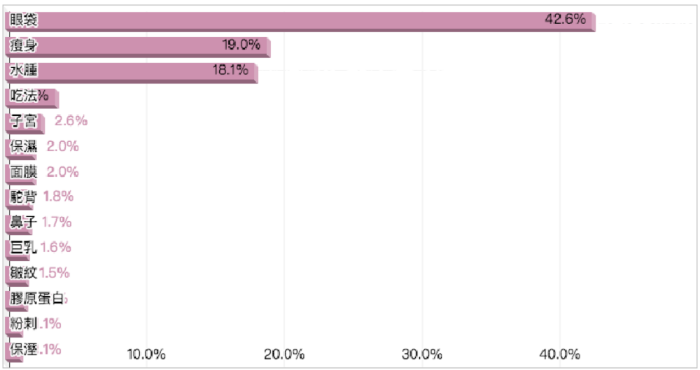 不分齡女性們最在意的保養問題,眼袋居然超越瘦身,成為女性最重視保養問題閱讀關鍵字之冠。除了數據調查結果之外,富盈數據調查小組也深入民間直接訪查門診醫師,名漾中醫診所微整形部負責人楊立達表示,近期女性消費者前往醫美進行保養治療時,真的有高達六成是為了想解決眼袋問題,楊立達說:「眼袋會成為消費者最關注的保養問題,主要跟低頭族和滑手機現象有很大的關聯,因為用眼過度而導致的眼皮鬆垮,上眼瞼肌無力確實會導致眼睛明顯鬆垮的現象」。因此數據的調查和實際的結果是相同的,真的不得不讚嘆大數據真的好精準阿!