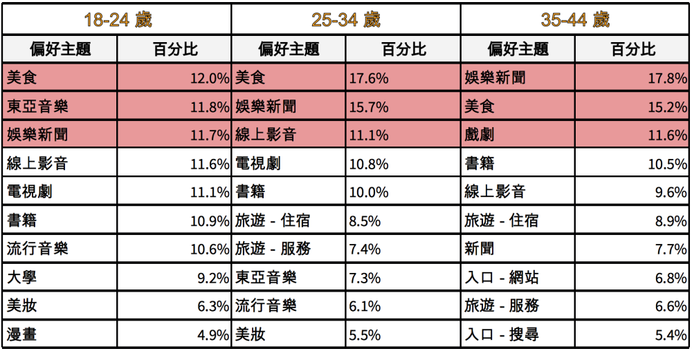 在文章種類喜好方面,娛樂新聞在各個年齡層女性喜好程度皆在TOP3 。美食類網站年齡越高者閱讀率越低,而新聞書籍類網站,卻隨著年齡增加比例開始上升。東亞音樂在 18-24的族群奪冠,而旅遊則是分布在從25-34開始進入十大排名。另外財經新聞與政治新聞則進入65以上年齡層的TOP10。