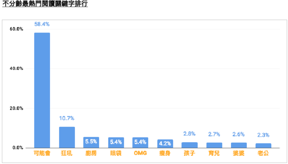 本次調查的總比例中,男性閱讀族群佔46.2%,女性53.6%,總計接觸280萬人次。本次研究單針對女性進行分析,依照各年齡層偏好及瀏覽類別,列舉各種分詞欄位進行探測,經由女性時尚類網站文章找出全站中與女性有關的項目進行分析,其中不分齡十大熱字排行字由「可能會」奪冠,因此可以判斷,在文章的標題或內文中注入「可能會」這種類型的懸疑字,讓女性族群關注的比例較能提升。還記得2017的年度熱門關鍵是什麼嗎? 是「沒想到」,下次撰文時就把這樣的懸疑性標題文寫進去,或許會達到令人意想不到的關注效果。