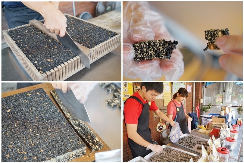 ▼分切好之後,一旁的服務人員連忙用扇子扇涼就可以包裝啦!大家一定想說為何不用電風扇吹一吹就好?老闆說如果用電風扇吹的話很容易外涼內熱,這樣口感就不好吃了~所以降溫不能太快,才會選擇最原始的扇子來讓它慢慢降溫!老闆特別拿剛做好的芝麻核桃給我們品嚐看看,熱的吃起來比較軟Q,帶點微微拔絲又不黏牙,冷的話吃起來比較鬆脆,口感截然不同啊!但同樣香甜又美味~喜愛的朋友可別錯過囉!