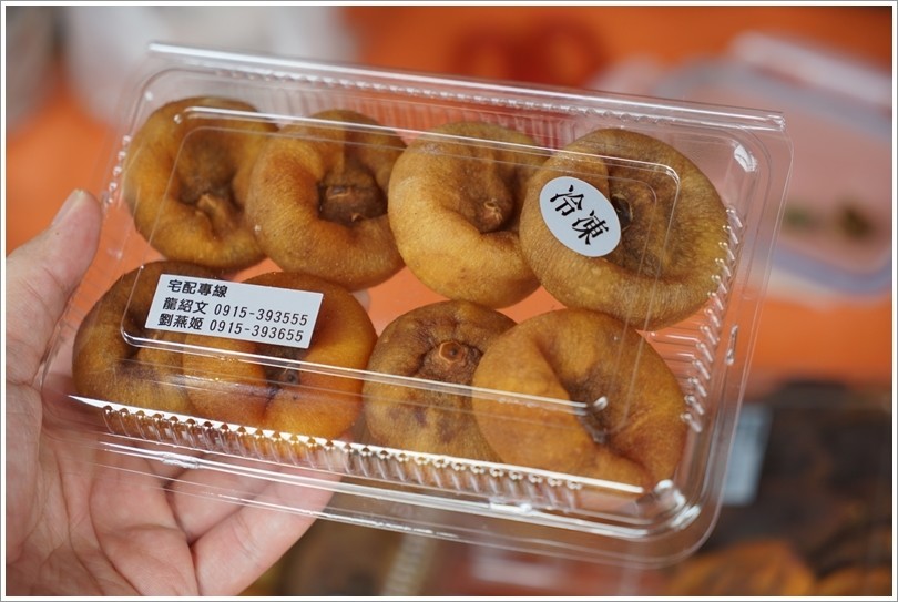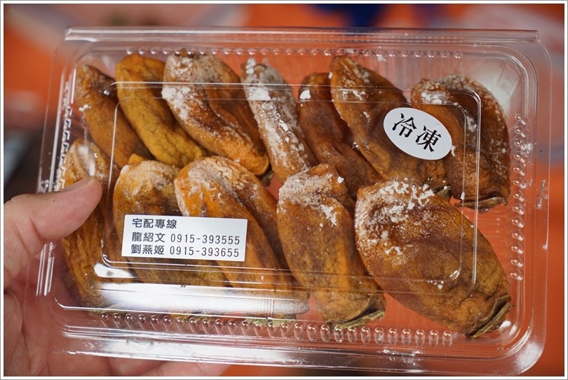 ▼上頭白白的是天然的柿霜,可別以為是發霉或壞掉囉!柿餅建議在常溫下可以放兩天,冷凍的話可以放一年,大口建議回家放冷凍拿出來吃最好吃,因為口感很Q又不會硬,冰冰涼涼很舒服!