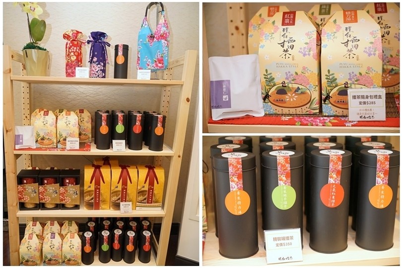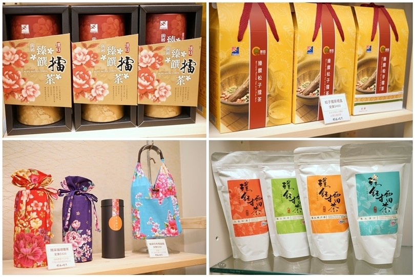 ▼架上還有不少擂茶的相關製品,不僅結合客家花布、圖騰做包裝,而且隨身包的設計實用又方便!