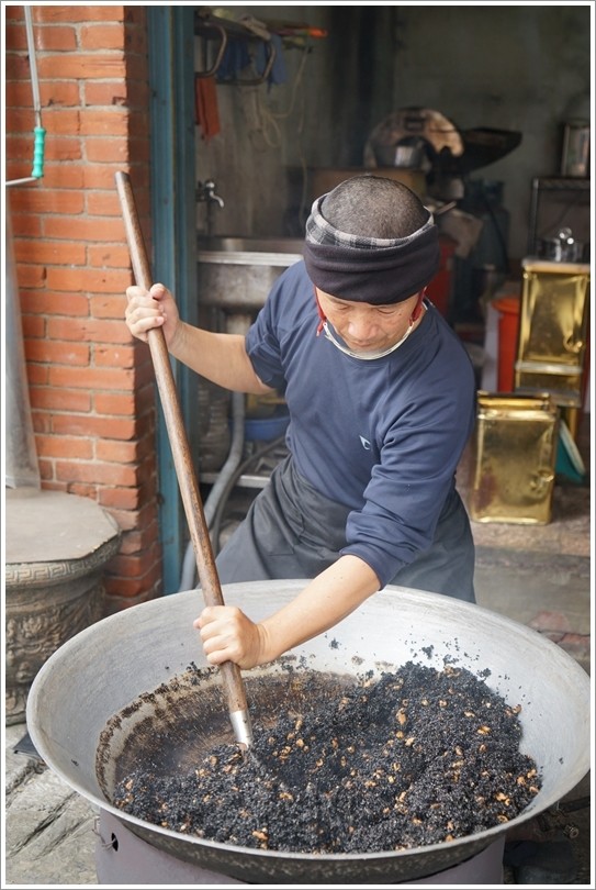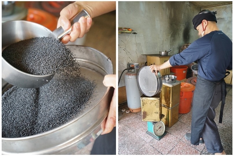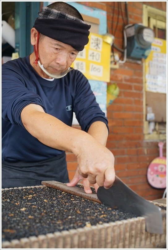 ▼接下來老闆就要開始每天的例行公事,也就是現場製作囉!我們運氣很好,剛好可以看見老闆在製作芝麻核桃口味的手工酥糖,只見老闆一開始先將黑芝麻過篩,去掉粉塵並過磅!