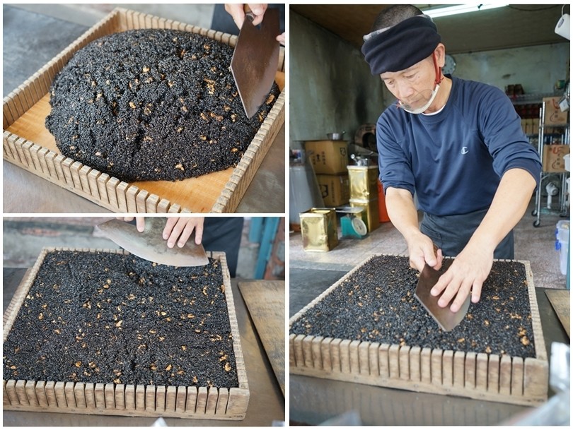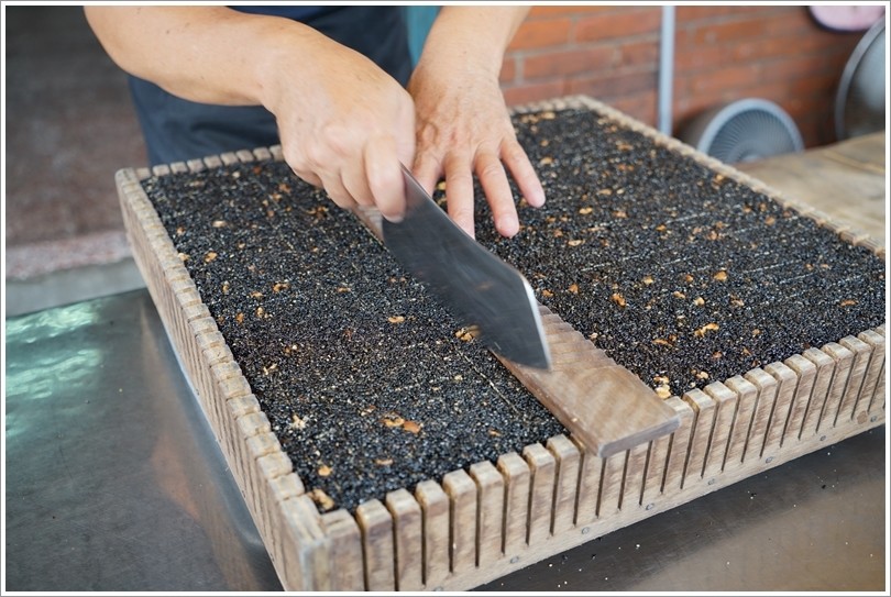 ▼拌炒好的芝麻核桃要立馬倒入特製的木頭模具裡頭,接下來再用刀抹平!