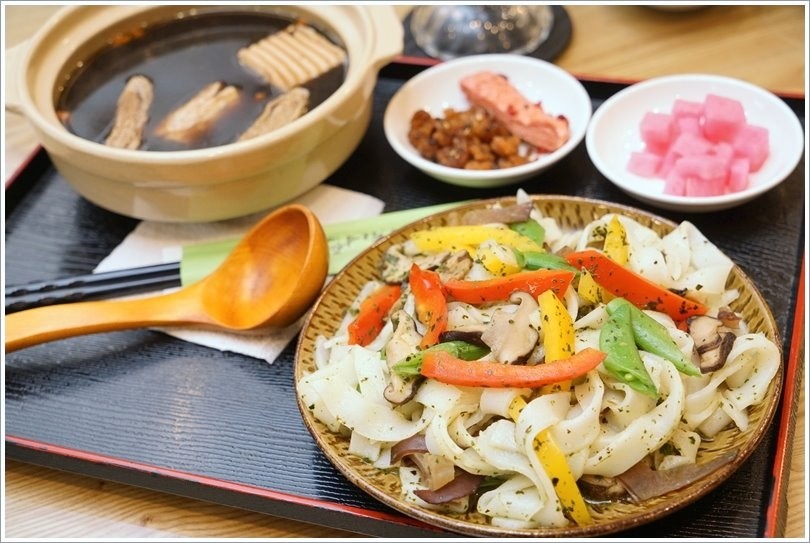 ▼Q軟的粄條搭配自製香椿醬,吃起來有淡雅的清香與蔬果的自然香甜,味道相當清新爽口!一旁的小菜有黃金麥片做的素肉、自製紅麴釀豆皮與醃蘿蔔,每一樣吃起來都好開胃啊!此外藥膳湯頭喝起來非常甜美,溫和不燥,搭配黃金麥片、百頁豆腐都很滑順好吃!