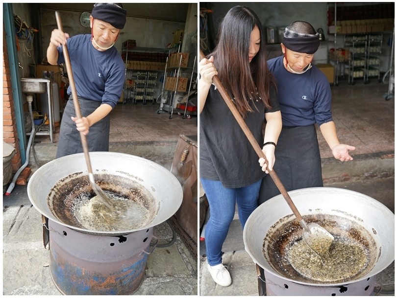 ▼光是炒製也需要功夫,等到麥芽糖沸騰後,要用鏟的方式才不會黏鍋燒焦,老闆還特別讓口咩試試看,看似簡單但其實做起來也非常費力又悶熱,真的很辛苦呢!但老闆為了做出絕佳美味,每天仍堅持這麼做!
