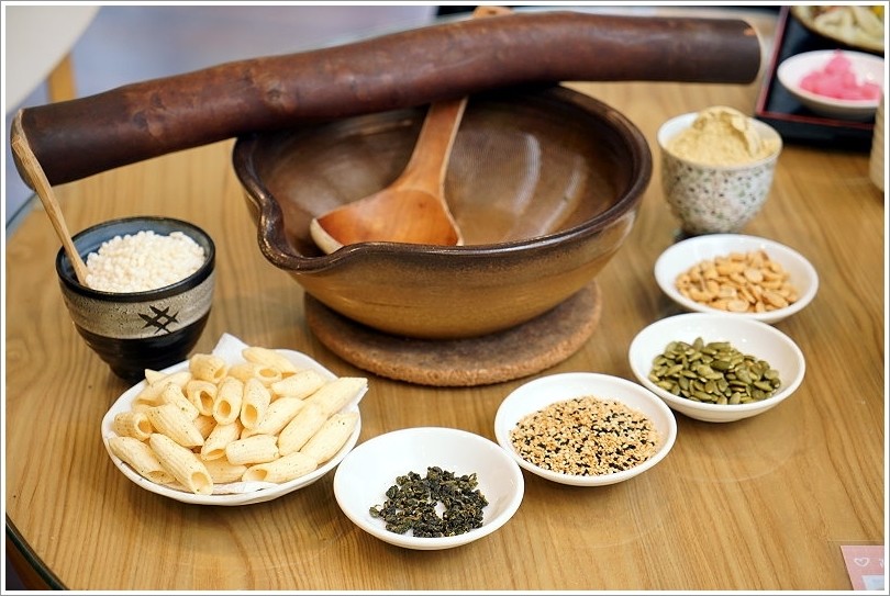 ▼擂茶DIY,店家會提供茶葉、芝麻、南瓜子、花生、擂茶粉、米香等六種配料及搭配享用的零嘴餅乾,依序倒入配料研磨後再加入熱水即可,一整個很有趣呢!想要體驗看看的朋友不妨可以來玩個DIY,大人小孩都適合!