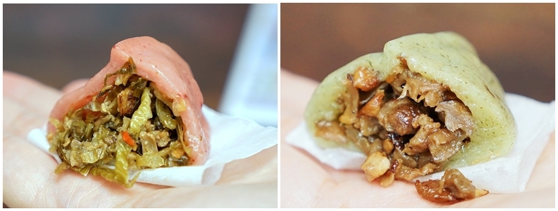 ▼艾草口味內餡跟原味一樣,不過外皮多了一股艾草的淡雅香氣,搭配起來滋味更加多元豐富!紅麴口味吃起來有酸菜的香氣與微微酸香微辣,搭配豆皮、絞肉等配料更增添口感層次,搭配軟Q的表皮更是美味好吃!