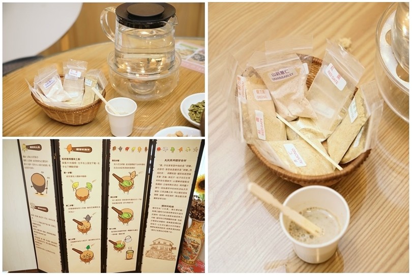 ▼店家還會提供用餐的朋友擂茶試喝,小籃子裡頭有各式各樣的口味,選好自己想喝的口味倒入小杯子中,再倒入半杯熱水攪拌均勻即可享用,方便又好喝!試喝喜歡的話還可以直接在店內購買回家分享唷~