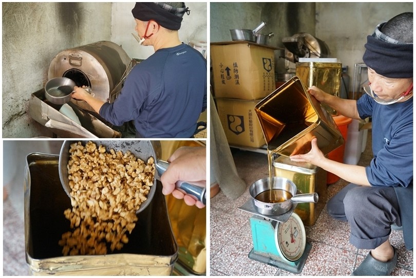 ▼篩選好的黑芝麻再拿進去改良後的糖炒栗子機器裡頭烘烤,只要調整好溫度、時間就沒問題啦!接下來核桃、麥芽糖也要過磅,等到核桃也一起烘烤完畢就可以開始拌炒啦!