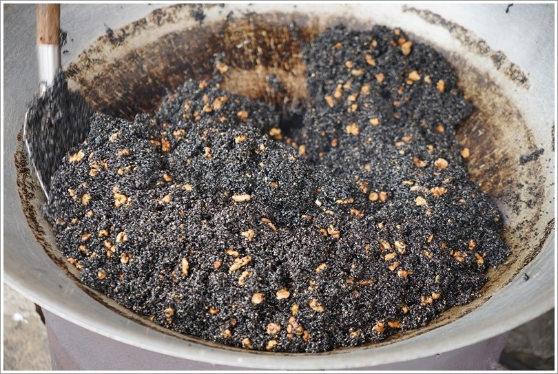 ▼等到麥芽糖水份都煮到快沒了,含水率大概1%左右,就可以將烘烤好的黑芝麻、核桃都下鍋一起攪拌,要均勻裹上麥芽糖才好吃唷!