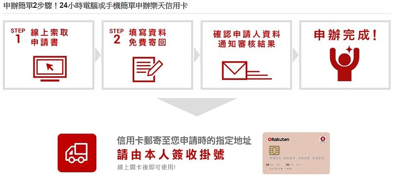 ▼而且申辦樂天信用卡也是非常簡單,只要上網索取申請書,填寫資料免費寄回後,確認資料、通知審核結果就完成了!最後就會郵寄到家,免出門就能收到信用卡,真的非常方便啊!