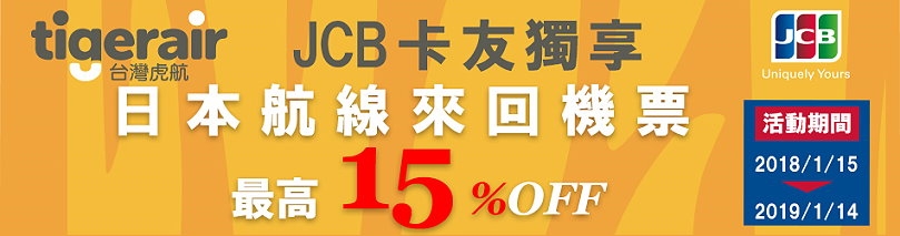 ▼另外買機票也有最高15%的優惠,只要在台灣虎航專屬網站用台灣樂天信用卡所發行的JCB卡購買日本來回機票,就能享有1人9折、2人85折的優惠,就能用更便宜的價格買到廉航的機票,真是省上加省啊!