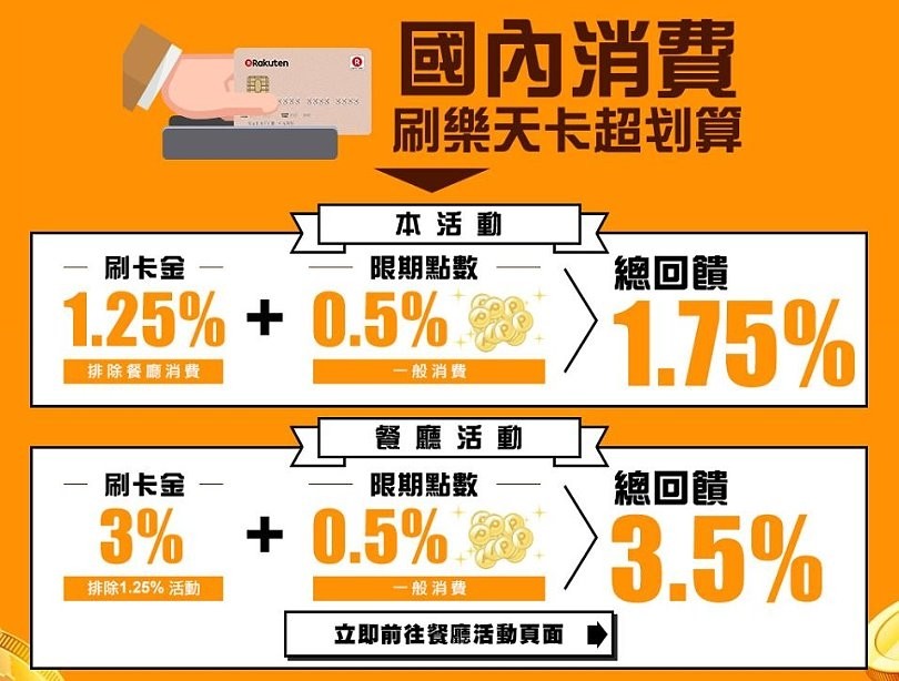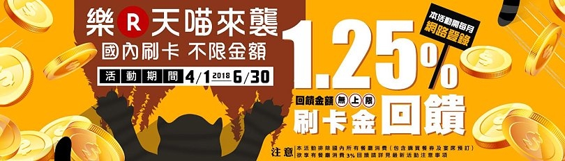▼不只是刷卡金1.25%的回饋,連原有的0.5%樂天市場點數回饋也還有包含在內,總回饋可以高達1.75%呢!此外登錄提供餐飲服務的餐廳也有3%的優惠,也是得當月登錄才有,最高回饋可高達10000元刷卡金回饋,對於常吃外頭的大口來說也是滿誘人的呢!(相關說明請點我)