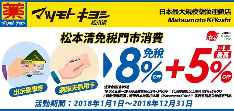 ▼另外還有超多分店的松本清也是買過超多次,現在只要出示優惠券並刷樂天卡,消費3萬日圓以上就能享8%免稅+5% off,真的是暢行無阻,走到哪買到哪啊!