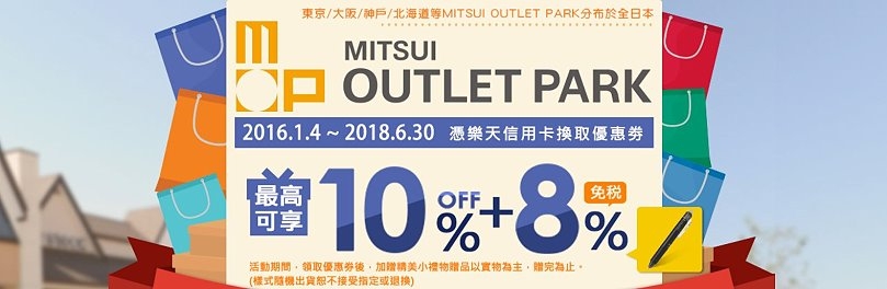 ▼另外像是東京、大阪、北海道等的MITSUI OUTLET PARK憑樂天卡換取優惠券,也是可以最高享10%+8%免稅,等於免稅又打9折,真是不錯!