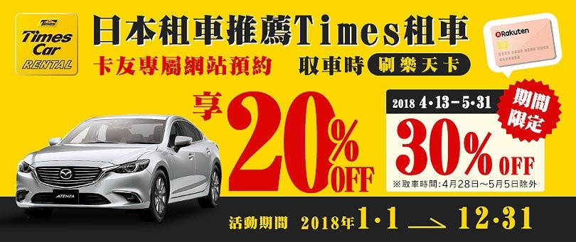 ▼自從有了小朋友之後,去日本玩耍大口一定都是直接租車比較方便,一方面比較不怕吵到別人,二方面臨時想泡奶、睡覺都沒問題啊!這時候刷樂天卡也是有不少租車優惠,像是日本租車推薦的Times租車就能享有20% off的優惠,期間限定還能享有最高30%優惠,真的是非常適合帶小朋友的家長啊!