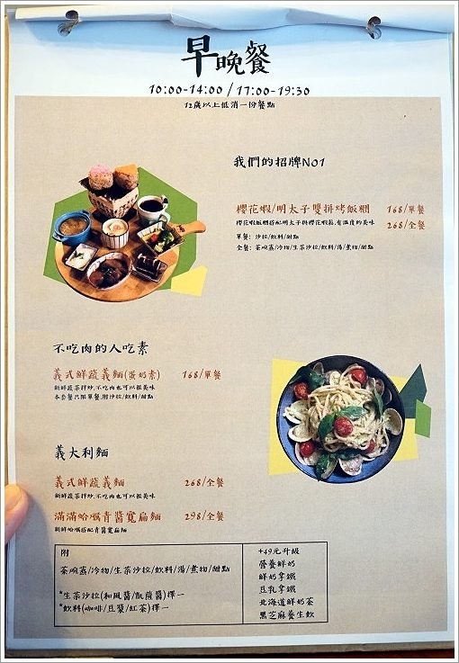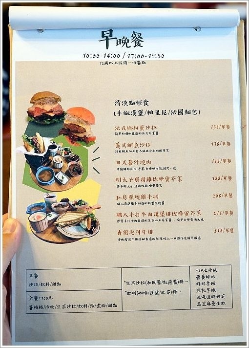 ▼菜單,這裡有分為早晚餐跟下午茶,有日式混搭洋風的感覺,看起來很特別!這裡的餐點有分為單餐與全餐,全餐只要加100元就能升級囉!