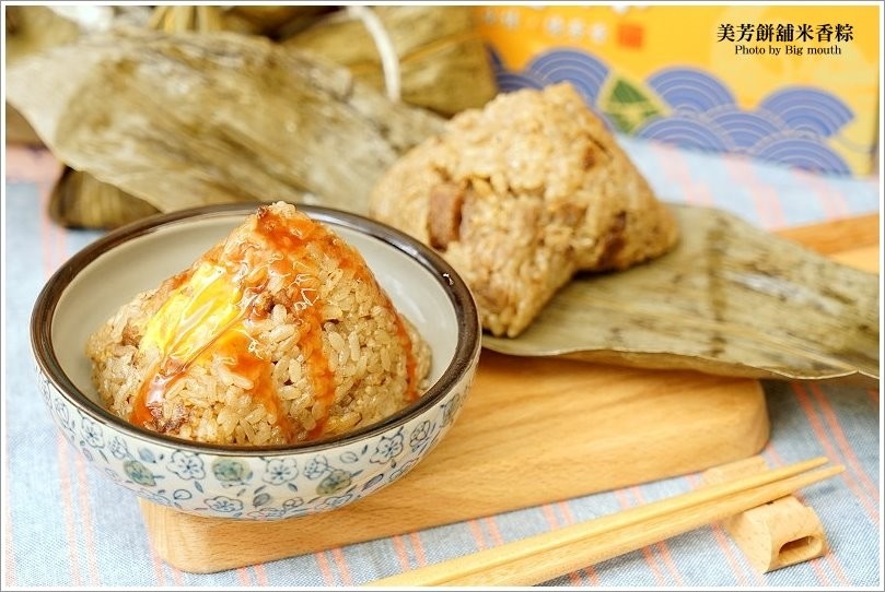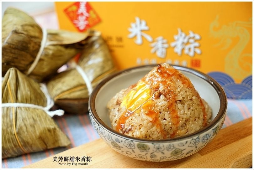 「美芳餅舖」的粽子不僅個頭不小、真材實料,以拌炒過的圓糯米為基底,搭配香菇、豬肉塊、菜脯等配料,吃起來香氣十足又耐吃,加上鹹蛋黃更多了一股鹹香的美味,搭配起來更是迷人!他們家的肉粽口味傳統用心,搭配特製帶點文青風的禮盒,不管是端午送禮或是自己享用都很適合,推薦給跟大口一樣喜愛肉粽的朋友,不妨也可以品嚐看看唷!